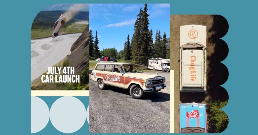 The plan was to outfit an old Jeep with the water brand’s logo and current tagline (“Chug Life”) and send it soaring off of a cliff in Glacier View, Alaska, as part of an annual Fourth of July car launch, recording the whole thing for social media. The hope was to make something entertaining enough to gain enough attention online and grow the brand’s social following while boosting brand awareness as Rambler moves into more markets nationally.